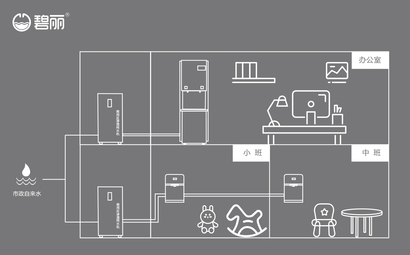 • 碧麗商用反滲透純水機(jī)將自來(lái)水集中處理后,把優(yōu)質(zhì)的純凈水通過(guò)專(zhuān)用的供水管道輸送到各飲水點(diǎn);
